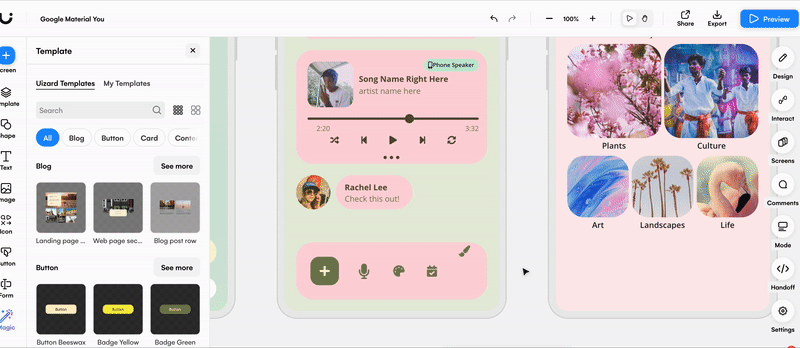To see this in action, why not try out Uizard’s Google Material You template? It’s fully customizable and can be edited using the drag-and-drop editor.