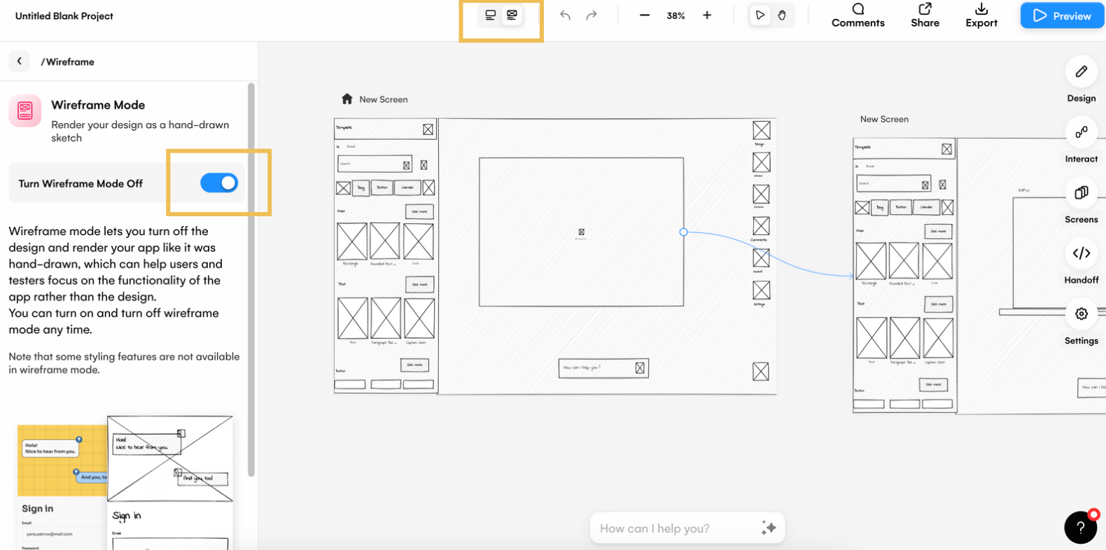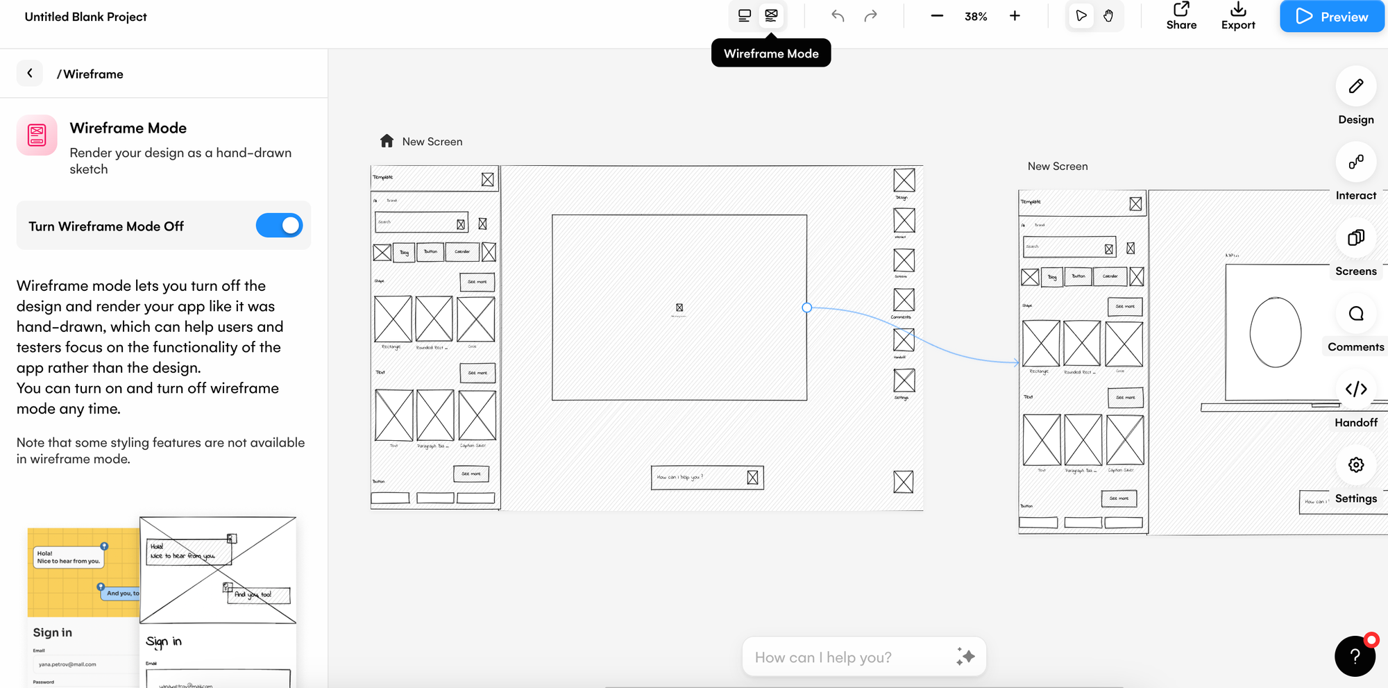 Uizard’s Wireframe Mode is a powerful AI feature that allows product teams to switch between high and low-fidelity using a simple toggle. This is great for analyzing the usability of a product solution, and for locating areas that require improvements. These low-fidelity visuals can also be shared with stakeholders as clickable prototypes, or as exported as assets via Handoff Mode. Gather feedback quickly and effectively when using Wireframe Mode to iterate on a product solution.