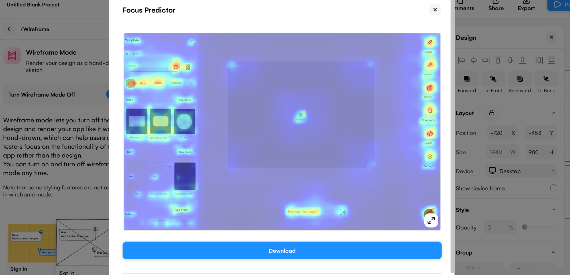 A digital wireframe provides a great opportunity to strip a product solution back to basics, and to analyze the usability of a layout. You can then iterate on it with your team or gather insight from developers. Our Focus Predictor can also be used alongside Wireframe Mode for an extra usability analysis.