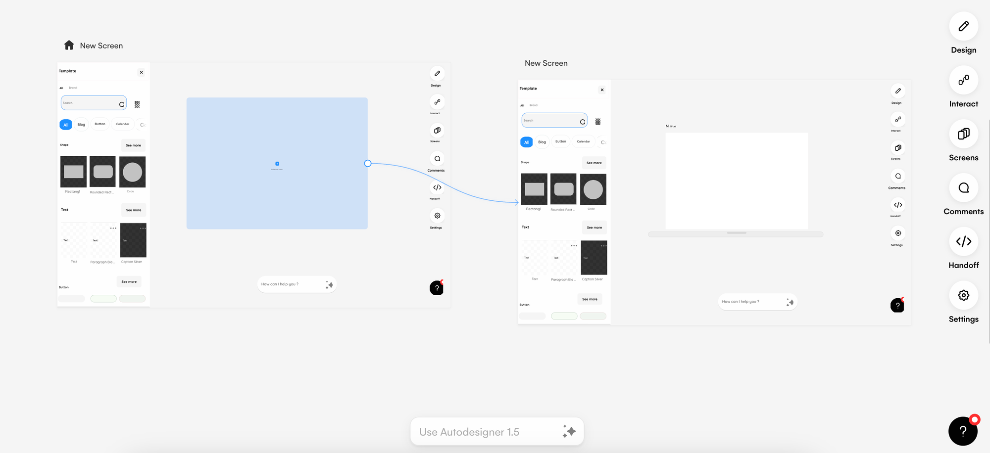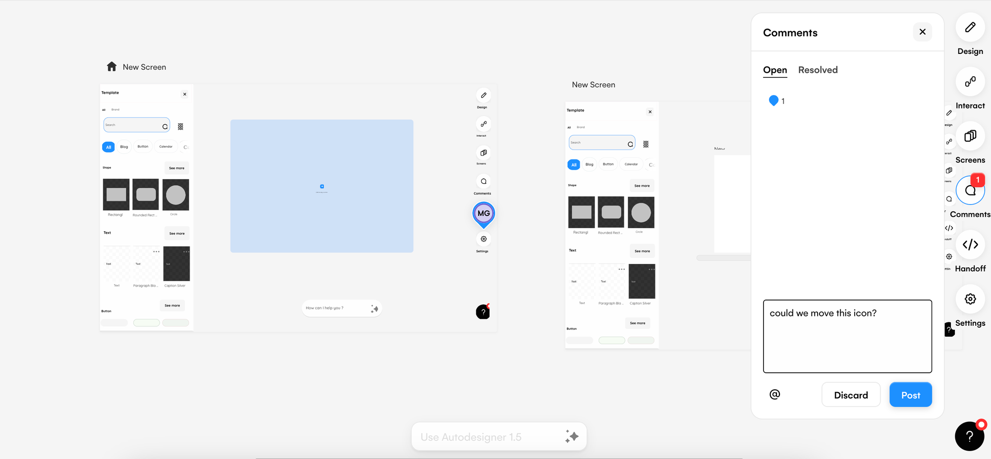 Communicating with your product team doesn’t have to stop at video calls or messaging services. For instance, there are multiple ways to communicate within the Uizard editor. Firstly, you can start a thread of comments on particular areas of your product visuals by selecting the ‘comments’ function on the right design panel. From here you can use the blue marker to highlight an area of your design, and leave a comment. You can also tag members of your product team to start a collaborative design discussion. Secondly, you can use the sticky notes to leave feedback, or comments on areas that require improvement or changes.