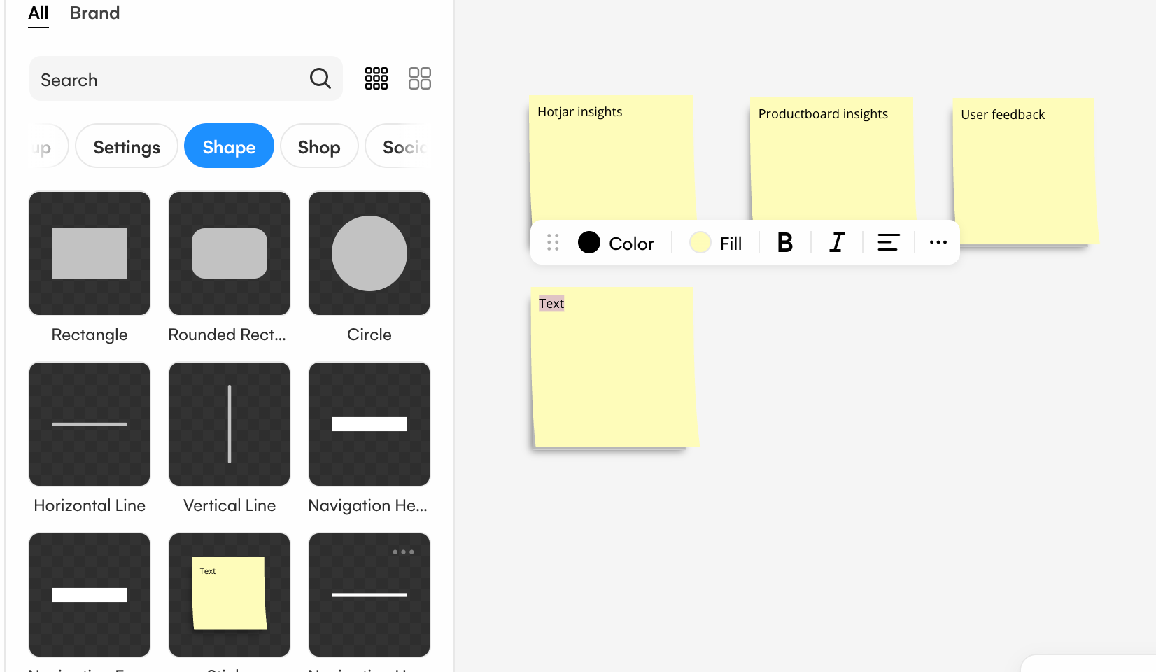 In the Product Discovery phase you can easily use the sticky note components in Uizard to capture and document opportunities and insights from user calls, Productboard, surveys, Hotjar and more. From here, Product Managers can then collaborate and ideate on potential product solutions in an easy-to-understand sticky note format.