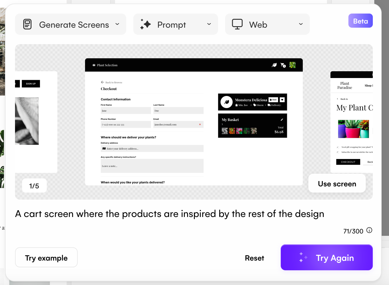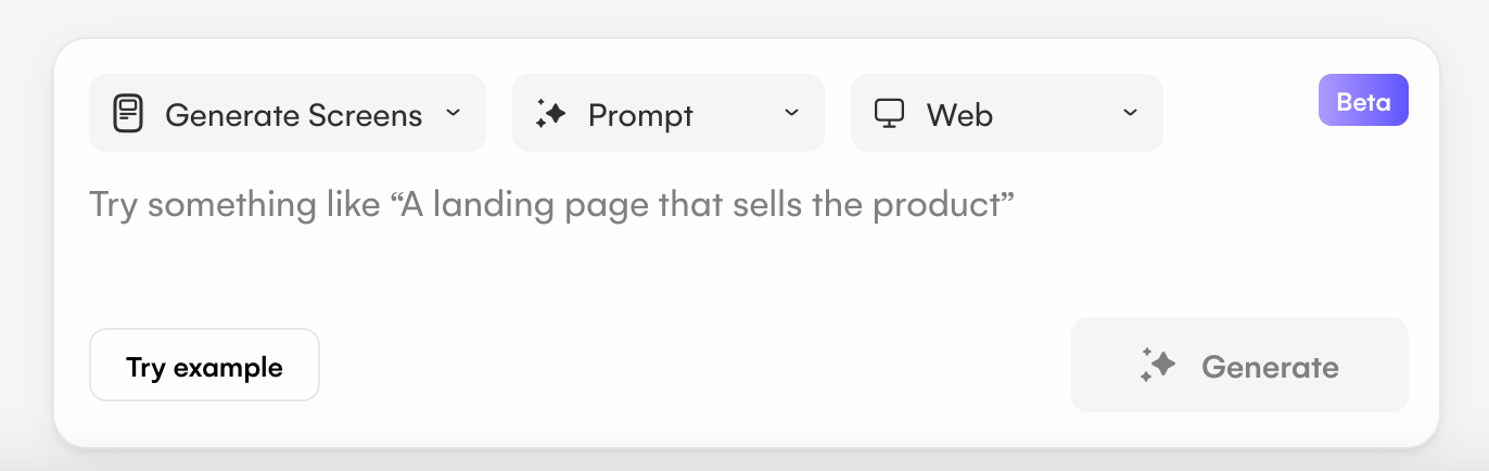 Much like generating a whole prototype with Autodesigner, you also have the option to use the ‘Try example’ button when generating a single screen. This is extremely useful when testing out what Autodesigner 1.5 has to offer, as well as learning the sorts of prompts you may want to use.