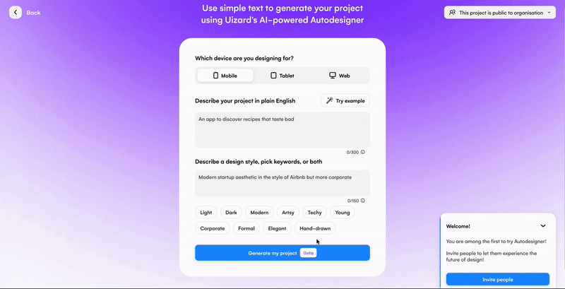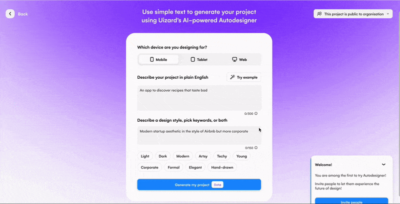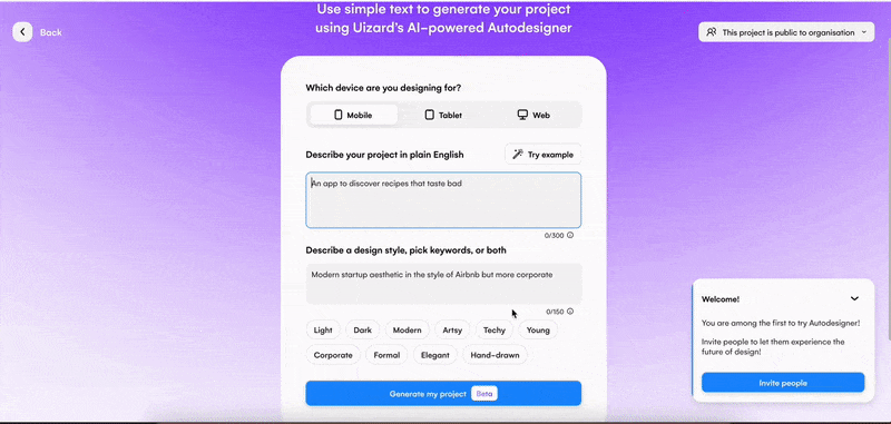 When starting a project with Autodesigner’s prototype generation, you can be as specific or non-descript as you would like. In this example, the prompts that were used are as follows: