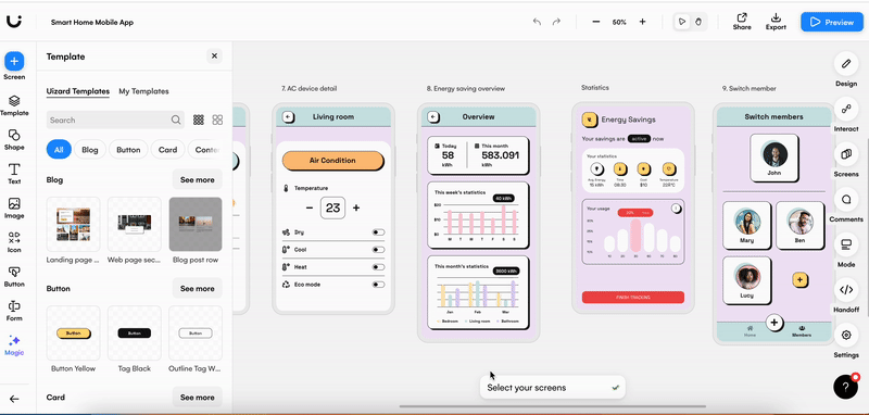 Whether you’re starting from scratch, using a UI design template or have already created a prototype with Autodesigner, you can easily complement and expand your Uizard project with an AI generated single screen.