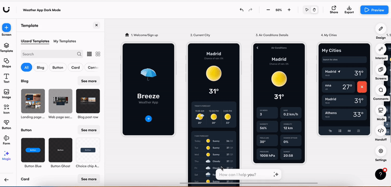 With Uizard Autodesigner you can generate multi-screen prototypes using prompts and keywords. Powered by AI, Autodesigner uses your prompts to create multiple design screens consisting of elements and components relevant to your prompt, as well as a fully mapped user flow.