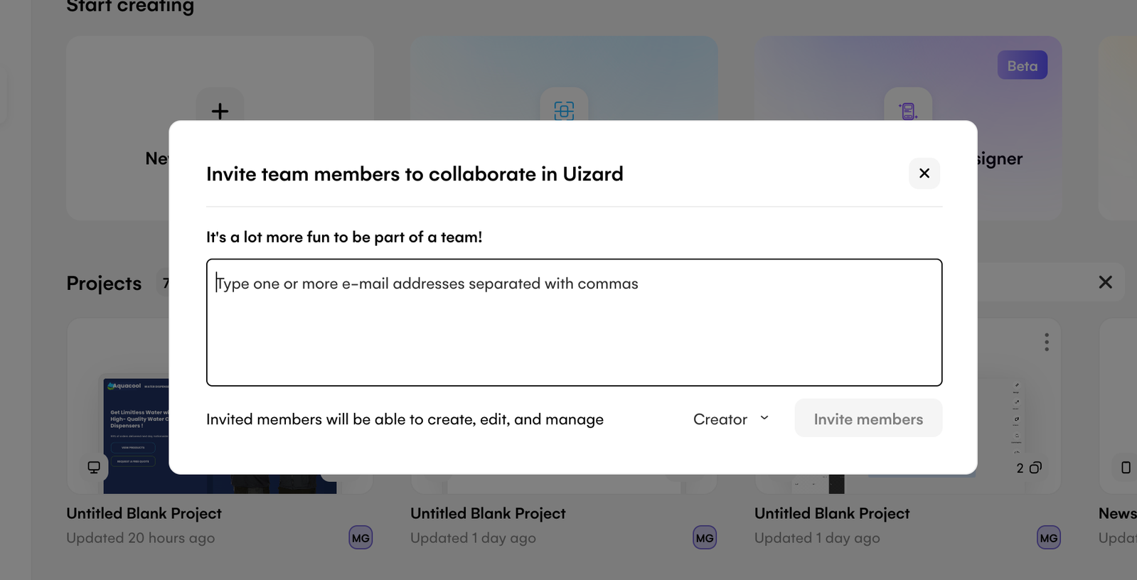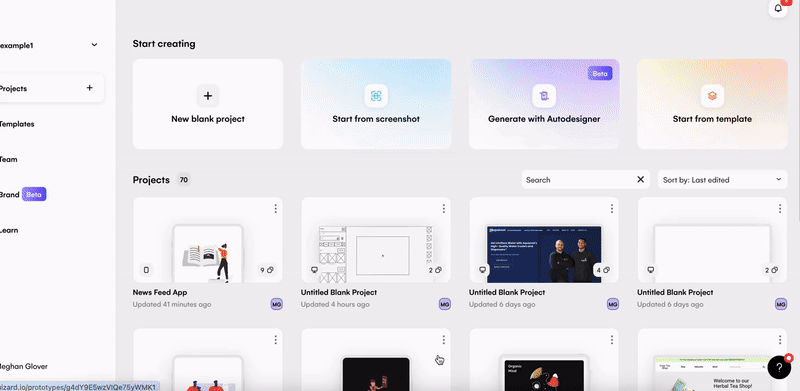 First things first, you will need to set up a Uizard account and invite your product team to your organization. Simply sign up, and then use the ‘Team’ tab on the left-hand side of your dashboard to invite your team members to work collaboratively in Uizard. This way, you can all iterate together on product solutions in Uizard.