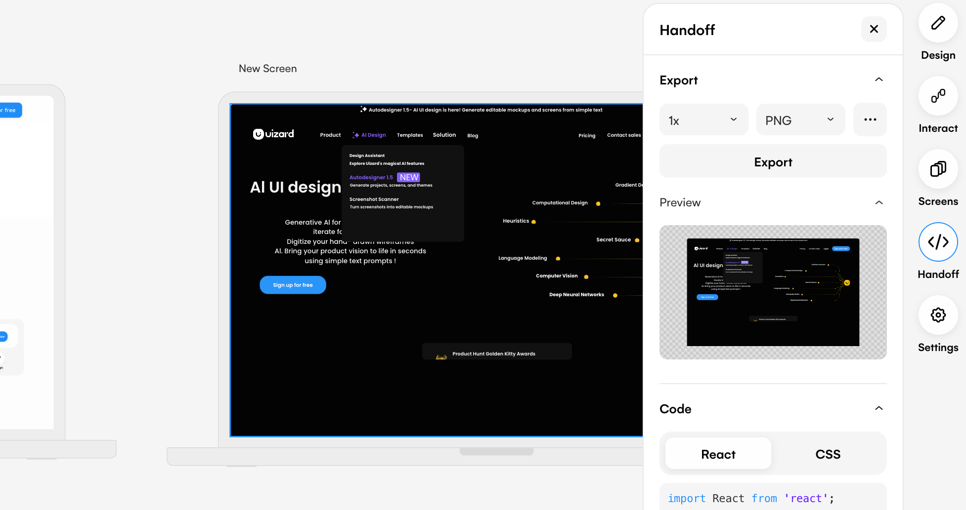 Uizard provides product teams with a platform to work collaboratively with developers to ensure that everyone is synchronized on the reasons behind a solution. It also provides team members with the opportunity to bring up potential problems before the solution is implemented, which saves time and money. With Handoff Mode, the process of handing over deliverables, or developers copying the code they need directly from the editor, massively speeds up the delivery process.