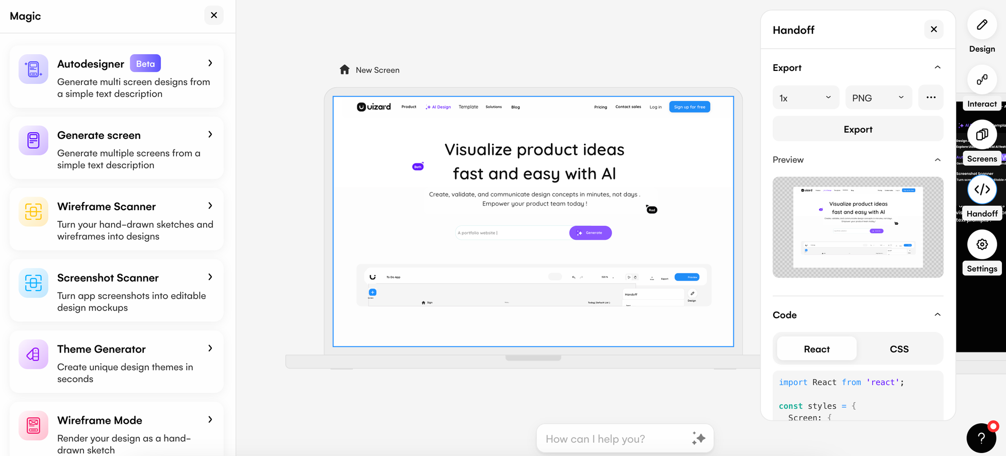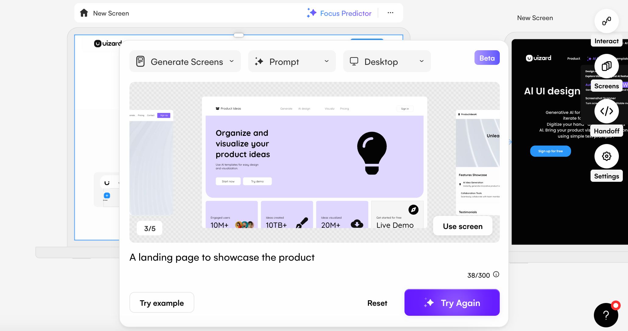 Finding solutions to bug fixes and feature improvements is faster and more collaborative in Uizard. Ideating in the editor offers product teams AI-generated ideas via the Screen Generator that can be used to create product visuals. By using Uizard you can complete ideation sessions with your team and move onto producing a visual representation of a solution to share with stakeholders and developers.
