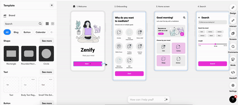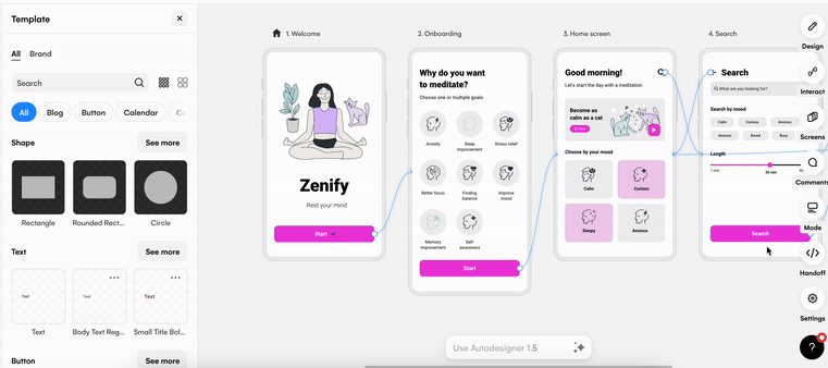 In particular, the beginning phases of the design process when your project doesn’t need to be pixel-perfect is where Uizard can help you. You can design freely and quickly in the editor, and share your ideas with the rest of your product team for quick ideation and iteration.