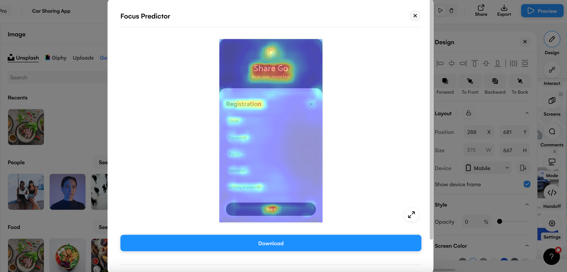 Product teams can also use the focus predictor function to create a personalized heatmap of a singular design screen. This feature allows you to help implement changes to the UX of your design, and action changes in no time.