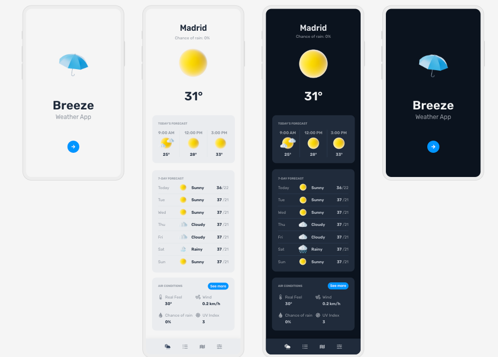 Using a Uizard template, you can easily create two app designs for both light and dark mode. Just take a look at the weather app design example below.