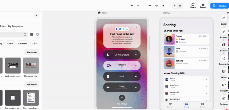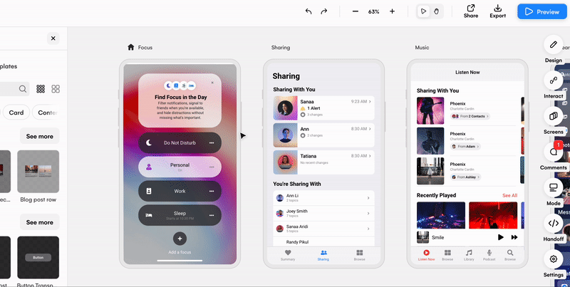 Here you can view your possible export as a preview before using the drop down menu to decide on an export format. From PNG to JPG, SVG and PDF, you can pick the file type that’s best for you, click the ‘export’ button, and then use your design elsewhere. Import your designs onto other tools to complete your design journey and become one step closer to publishing your iOS app design.