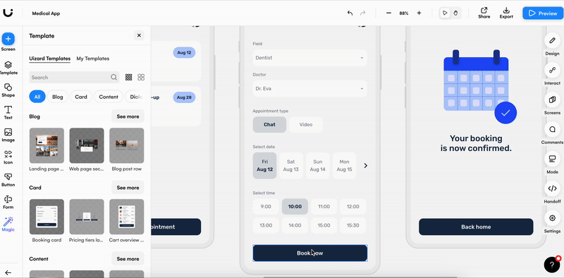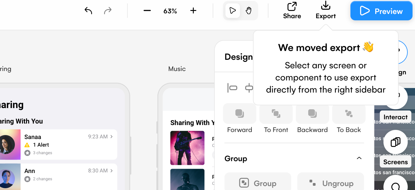 Originally, the export function was located in the top right corner of the platform next to the preview function. However, to incorporate more options for Uizard users, it has been moved to the design panel on the right.