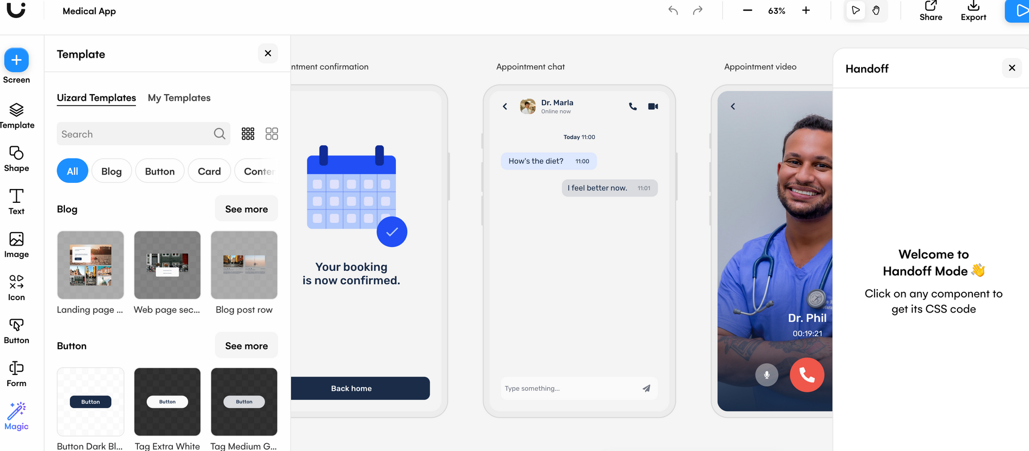 Handoff Mode can be found in the menu on the right-hand side of the Uizard editor. Once you're happy with your Uizard project, you can select any component or element in your design, and hit the Handoff Mode button to get started. From here, you will have instant access to the CSS properties of your chosen component or element. Simply hit the copy code button to use elsewhere.