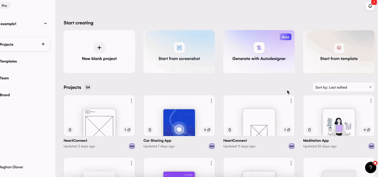 When you need to put together visuals quickly, this is where AI comes in handy. From a simple text prompt to a multi-screen high or low-fidelity prototype, it’s easy to generate entire product projects with Autodesigner. It’s a great way to ideate, and it cuts down an otherwise time consuming task. You can even use the Autodesigner widget at the bottom of the editor to generate a new screen, theme or image for a project using AI too.