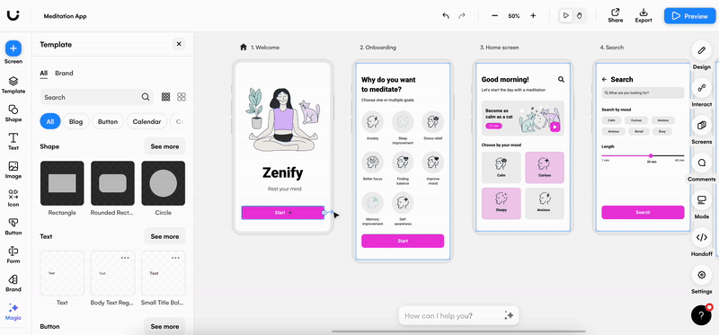 Start from scratch: With a blank canvas you can design your prototype using our many AI-powered features, and populate each design screen using our expansive UI components library. It’s then easy to use the mapping tool to create an interactive prototype.