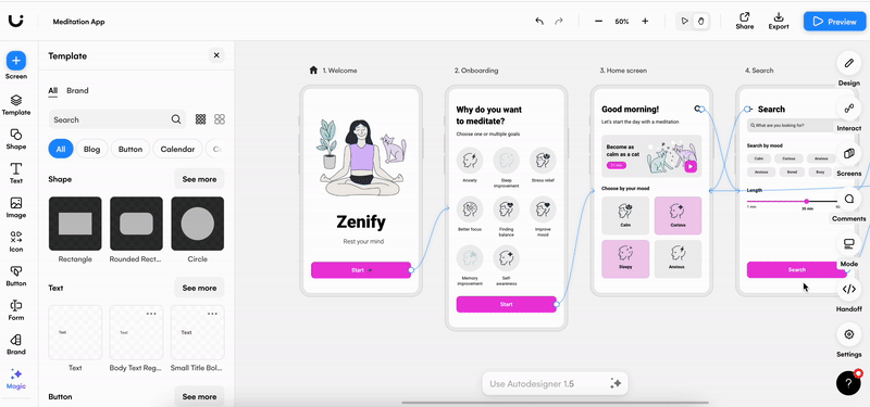With Uizard, you can create fully-fledged prototypes from scratch or from a ready-to-use UI template in no time at all. You can even generate a multi-screen design, complete with a user flow, from just a few text prompts using Uizard Autodesigner. So if you’re feeling stuck, don’t let the closure of InVision stop you from creating amazing prototypes — create them with Uizard.