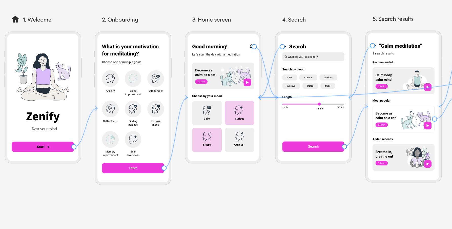 Go from mockup to interactive prototype with the user flow mapping tool. All you have to do is select a component and use the lightning icon to link it to another design screen. You can then use the preview function to click through your prototype and check your user journey.