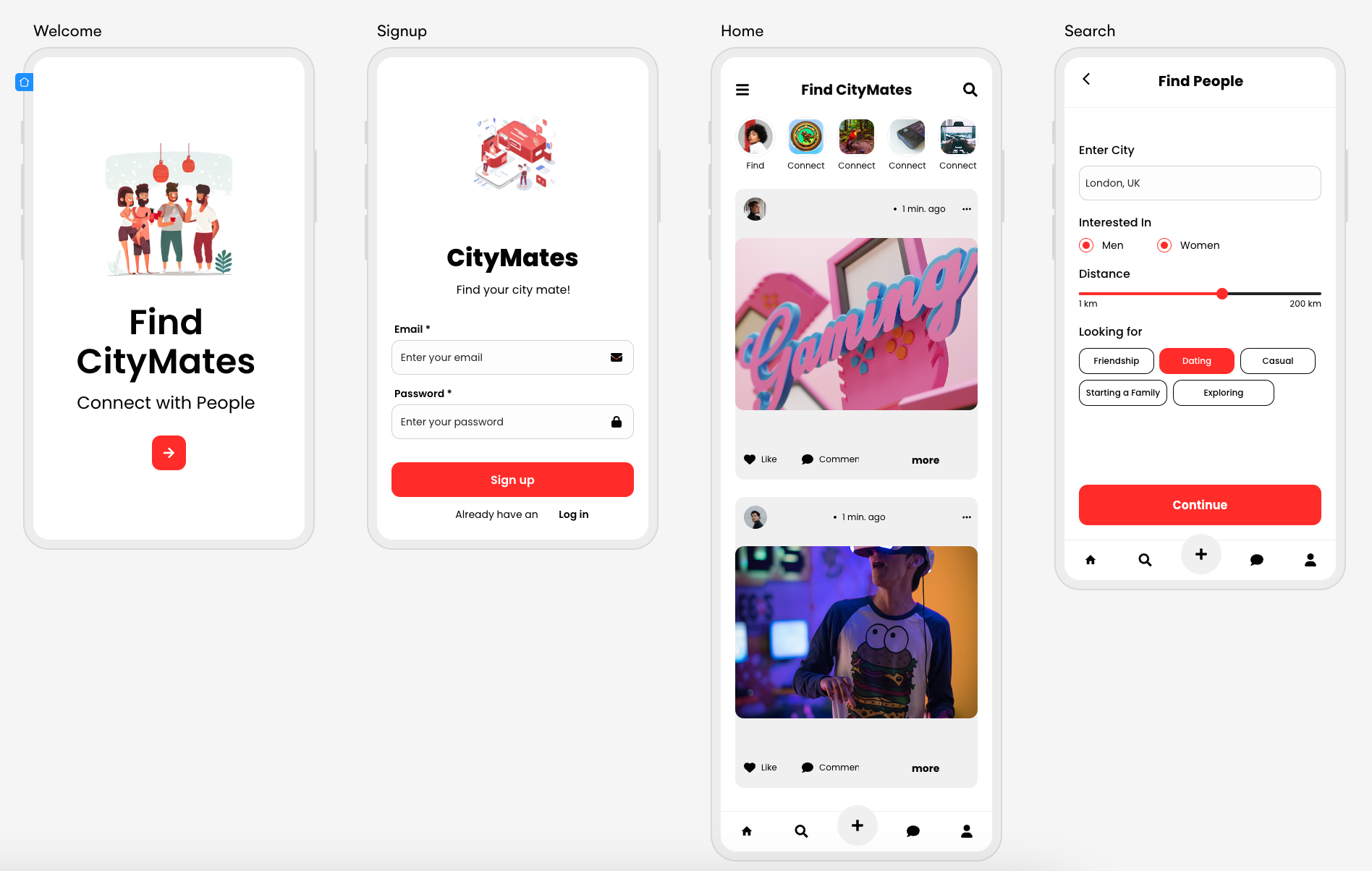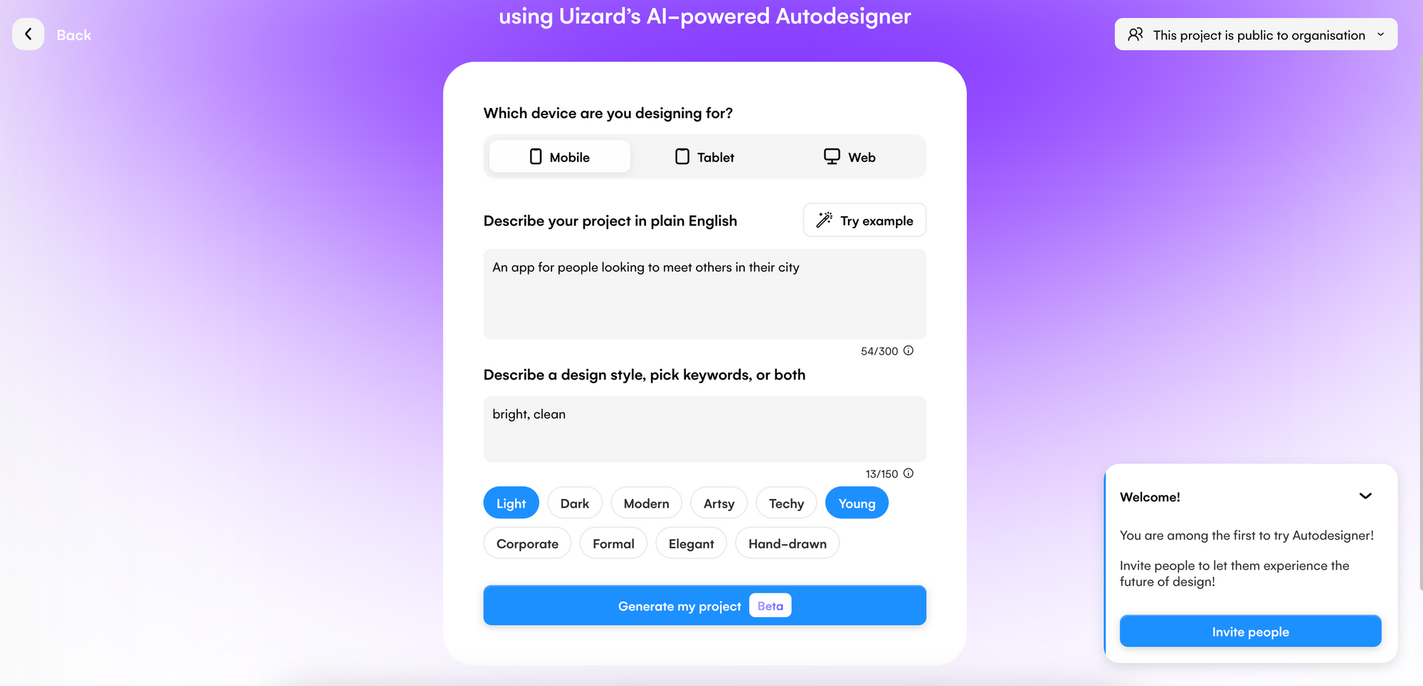 Here the prompt ‘An app for people looking to meet others in their city’ was used, along with the design style description ‘Bright, clean’.