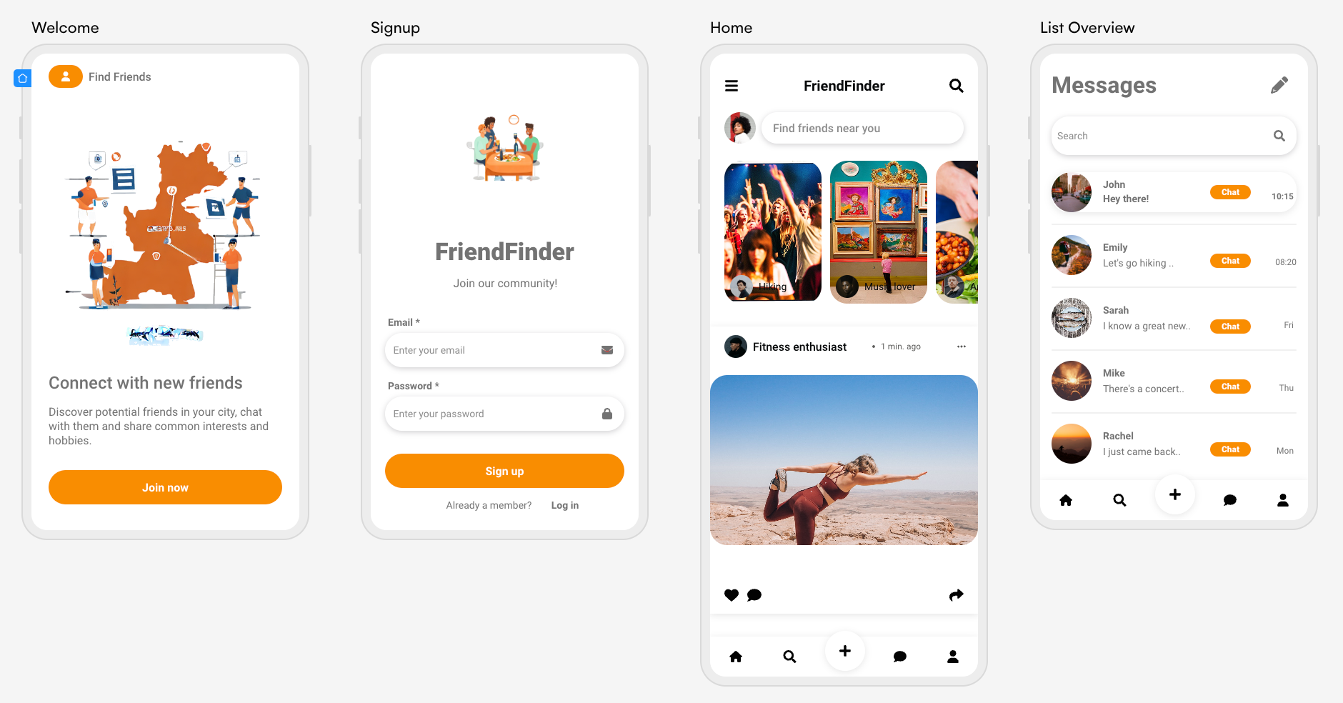 Here the prompt ‘An app for people in their 20s looking to make friends in their city’ was used, along with the design style description ‘Orange elements, preppy style, rounded buttons’.