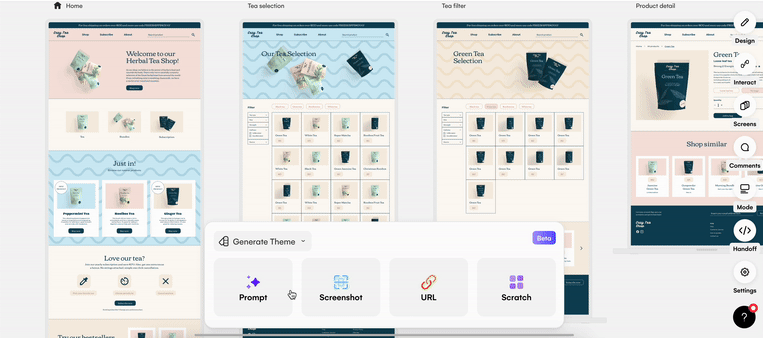 Using prompts, you can generate and apply a new design theme to your entire project using the Theme Generator. Within the Autodesigner widget at the bottom of the editor, you can use the dropdown to select the ‘Generate Theme’ function. Here you will find a number of theme generation options, one of which is theme creation from a prompt. So, all you have to do is enter your desired prompt such as ‘Pink vibrant startup style’ and use a few keywords to supplement your choice. When you click ‘Generate’ you will get to preview your new design theme before applying it to your whole project.